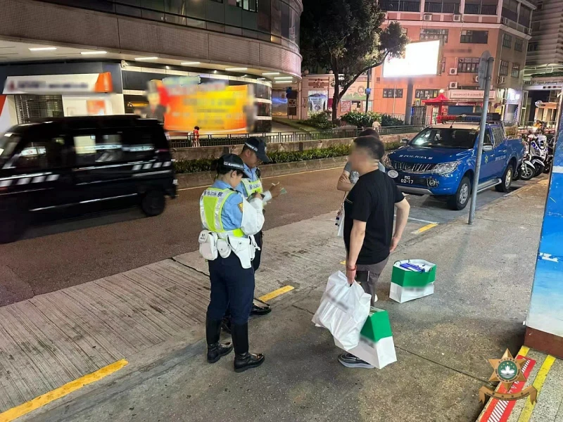 マカオ治安警察局が違反頻発地点のひとつで実施した歩行者の道路横断違反に対する取り締まりの様子=コタイ地区・新城大馬路付近(写真:マカオ治安警察局)