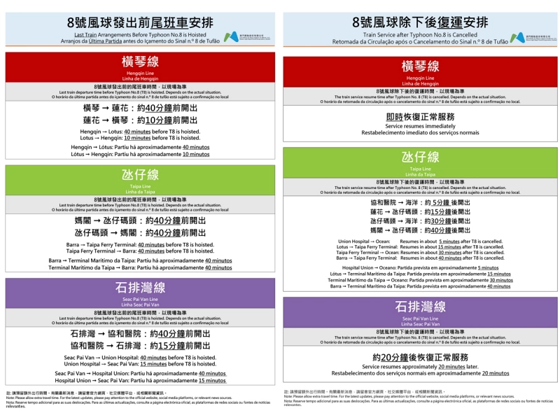 マカオLRTの台風シグナル8から3以下へ引き下げ後の運行再開について、従来は約2時間かかるとされており、路線バスと比較して所要時間が長いことが社会的関心事となっていた。なお、同社によれば、実際の運行再開時間は路線の点検の状況により変更が生じる可能性があるとのこと。同社では、乗客に対して台風時は時間に余裕を持って出かけてほしいとし、公式ホームページや公式SNSアカウントの最新情報に留意するよう呼びかけている。