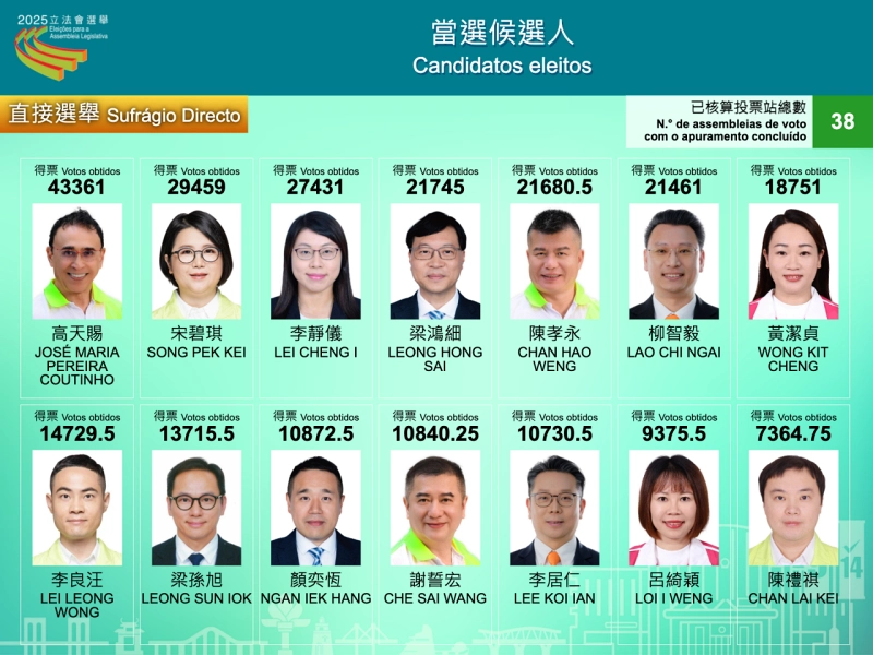 直接選挙の投票結果は、候補を立てた6陣営のうちポルトガルにルーツを持つジョゼ・マリア・ペレイラ・コウチーニョ(高天賜)氏が率いるノバ・エスペランサ(新希望)が最も多い4万3361票(得票率26.73%)を集め、3議席を獲得。このほか、得票率18.16%で2番手のアソシアサオン・シダダオン・ウニドス・デ・マカオ(澳門民聯協進会)が3議席、残る4陣営は各2議席という結果に。