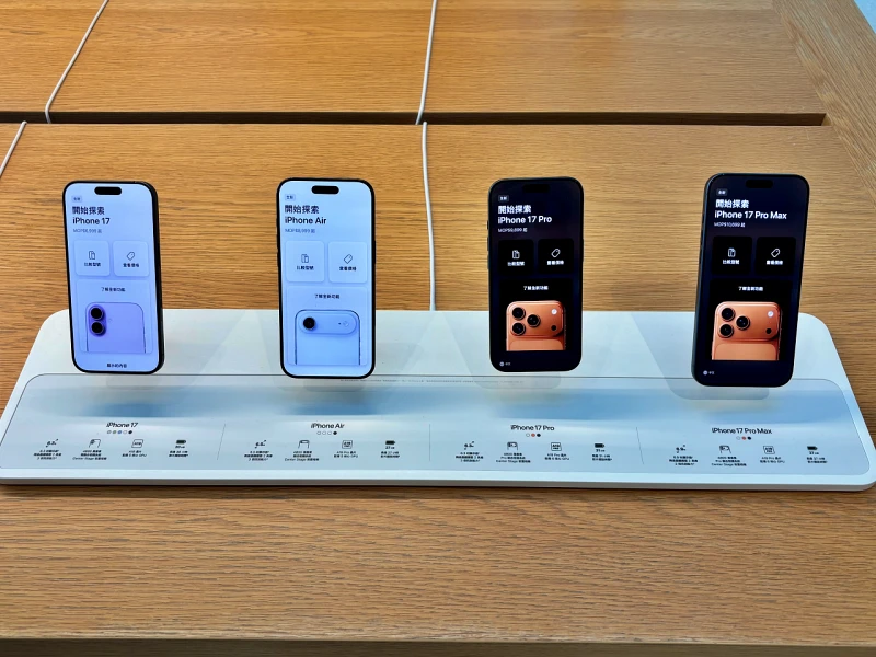 iPhone17シリーズの香港・マカオ版はAirを除き物理SIM対応しているところが特徴の一つ=2025年9月19日朝、アップルストア(コタイストリップ店)にて本紙撮影
