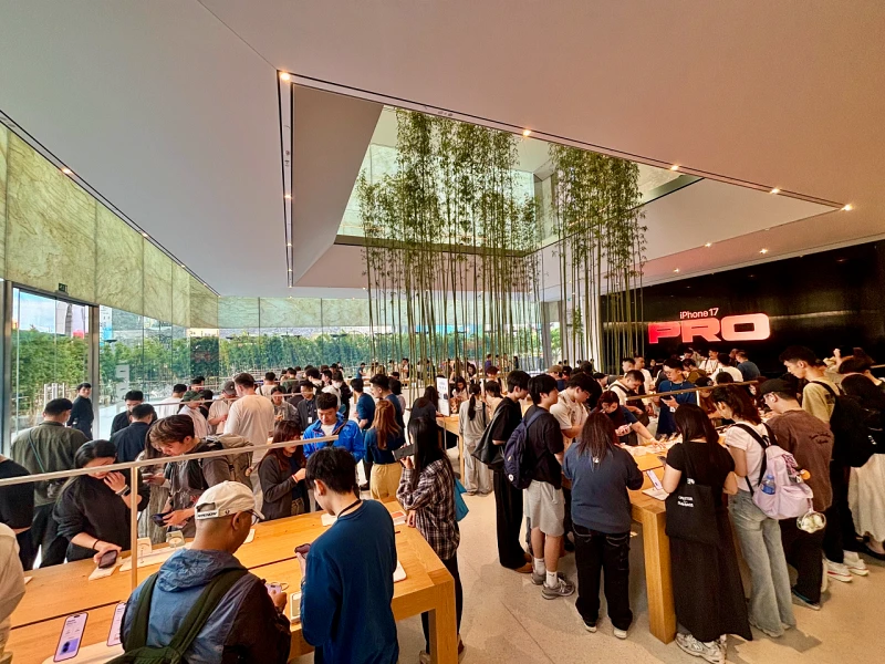 iPhone17シリーズなど注目の新製品が発売され、多くのファンで賑わうアップルストア(コタイストリップ店)=2025年9月19日朝、本紙撮影