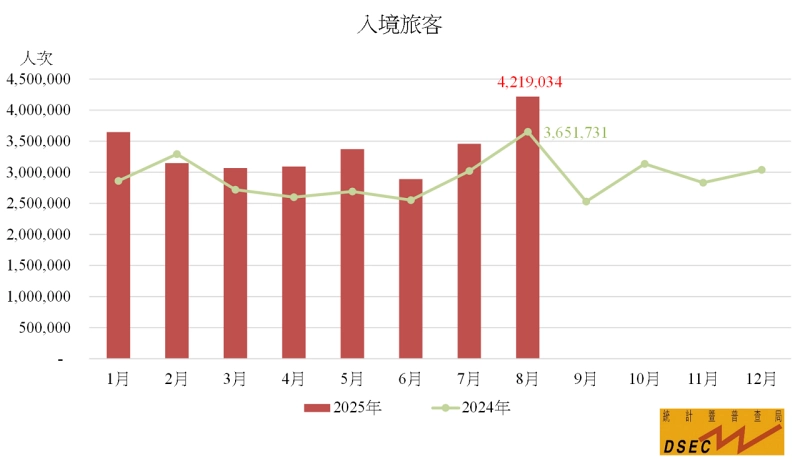 マカオ政府統計・センサス局(DSEC)は9月19日、今年(2025年)8月及び1〜8月累計の訪マカオ外客数(インバウンド旅客数)統計を公表。