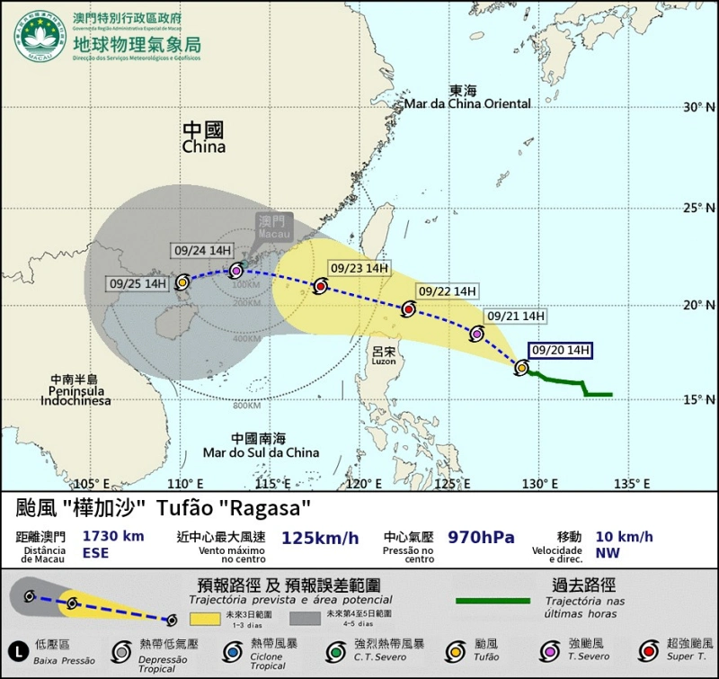現在の予想進路によると、台風18号は来週初めにも南シナ海の北部へ移動する見込みで、その環流が非常に広範囲に及ぶことに加え、北東季節風の影響も重なり、マカオでは来週火曜日(9月23日)の遅くから風が著しく強まる見通しとのこと。その後、マカオの位置する珠江の河口に再接近し、マカオから半径100キロメートルいないを通過することも排除できず、その場合には風力が9〜11級(平均風速が時速76〜117キロメートル)に達する恐れがあり、集中豪雨や雷雨が頻発する見込みといい、顕著な暴風潮も出現が予想され、増水と満潮が重なる時間帯には、2017年の台風13号(ハト)や2018年の台風22号(マンクット)と同レベルの浸水被害が生じることもあり得るとした。