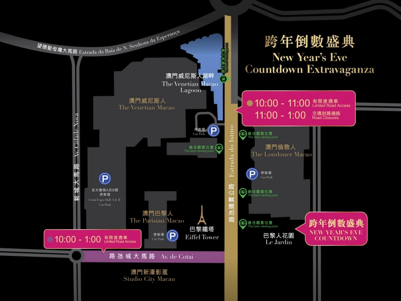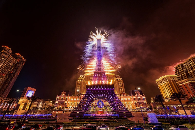 具体的には、大晦日の午後9時半からIR「ロンドナーマカオ」の南側に位置する芝生広場「Le Jardin」の特設ステージでローカルに人気のバンド「Penthaus」と「Blue Note」がDJとともにライブミュージックでカウントダウンを盛り上げ、午後11時55分には会場正面に位置し、IR「パリジャンマカオ」のアイコンとして知られるマカオ版のエッフェル塔(パリのものの約半分のサイズ)でライトショーが始まり、盛大なカウントダウンに突入。午前0時、新年を迎えると同時に、ヴェネチアンマカオ、パリジャンマカオ、ロンドナーマカオを含む同社の系列IR施設から約8分間にわたって音楽とシンクロした花火パフォーマンスが行われるという。
