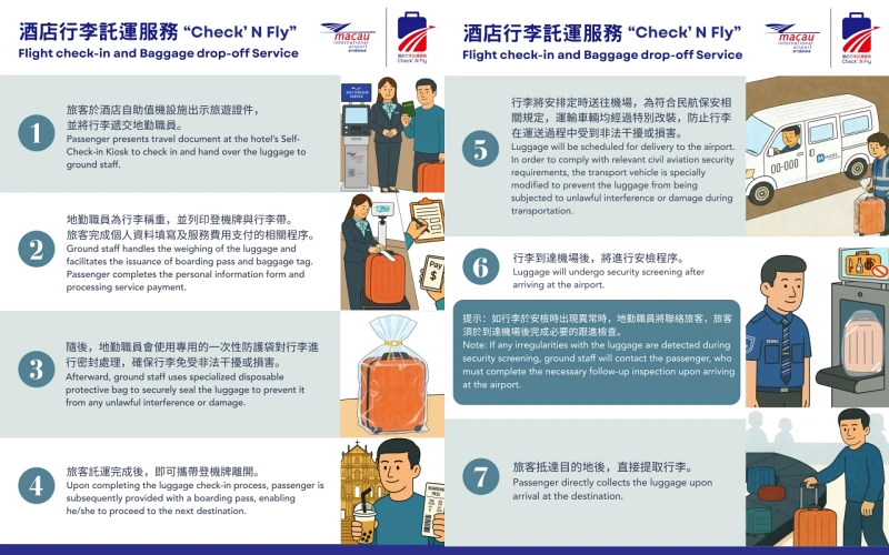 初期段階での協力ホテルは「ホリデー イン エクスプレス マカオ シティ センター」(マカオ半島新口岸地区)と「クラウンプラザ マカオ」(マカオ半島黒沙環地区)の2軒、また対象となる航空会社はマカオ航空(NX)の当日便のみで、将来的に対象航空会社及び協力ホテルの拡大を見込んでいるとした。