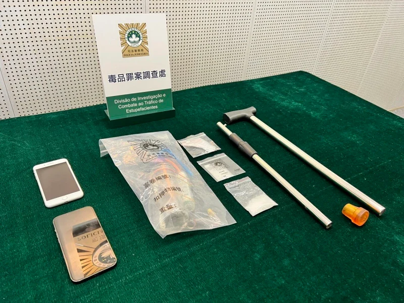 同局が配備を敷いていたところ、この男が2月3日に香港から港珠澳大橋を経由してマカオ入りしたことから、港珠澳大橋マカオ側イミグレーション施設内で逮捕。この際、男が使用していた杖の空洞部から白い粉末状の物体が入った小袋2つ(合わせて約17.43グラム入り)が見つかり、同局刑事技術部門による緊急検査で、当該物品が末端価格にして約5.2万パタカ(日本円換算:約102万円)相当の覚醒剤”アイス”であることが確認され、また男の自宅を捜索した結果、”アイス”の吸引用とみられる器具の発見に至り、男の当該薬物に対する尿検査結果は陽性だったとのこと。